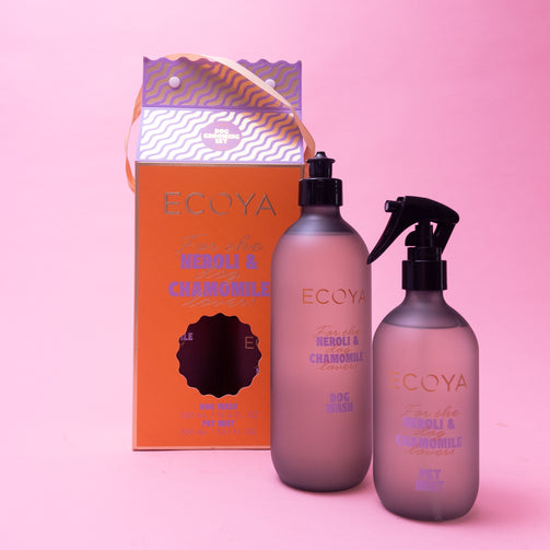 Pamper your dog with The Dog Grooming Set, featuring a soothing Neroli & Chamomile Dog Wash (550mL) and a refreshing Pet Mist (300mL), suitable for both your pup and its resting spot.