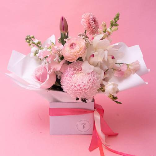 Introducing Frankie—a charming water-filled box featuring a classic, girly posy of pretty seasonal blooms.
