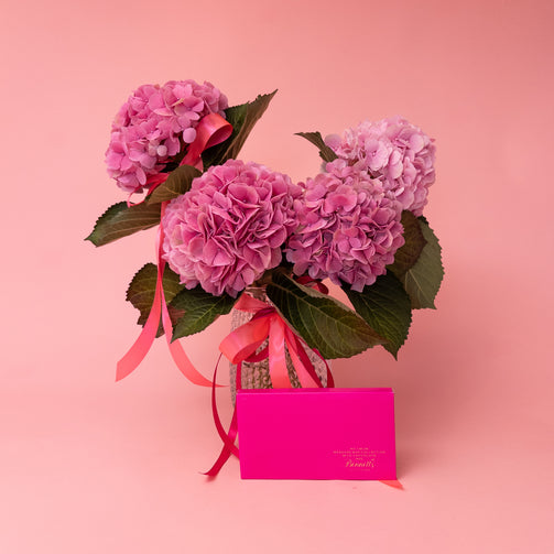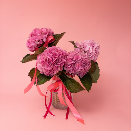 5 beautiful export grade Hydrangeas, packaged in one of our beautiful dimple vases!
