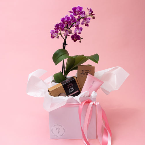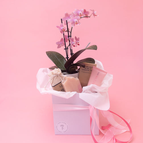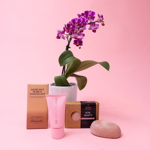 Indulge in our adorable colored mini Phalaenopsis orchid plant, elegantly potted in a white ceramic pot. This charming plant is paired with your choice of Bennett’s chocolate bar, a luxurious Rimu Gulley natural soap, and a soothing Ecoya hand cream.